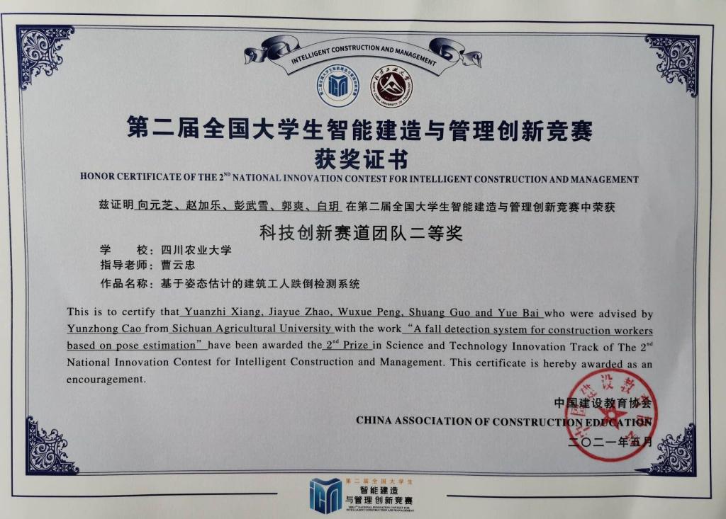 CV智造团队的作品《基于姿态估计的建筑工人跌倒检测系统》获A赛道-科技创新赛道团队二等奖。
