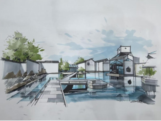 最后,孙超老师现场手绘了一张苏州博物馆建筑速写。他用鸭嘴笔快速勾勒,找准建筑大体形态,又以马克笔填涂上色,短短45分钟就流畅地完成了画作,技艺精湛,现场掌声不断。